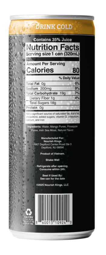 A refreshing blend of mango and pineapple with Irish Sea Moss. Best enjoyed cold. Shake well before drinking.