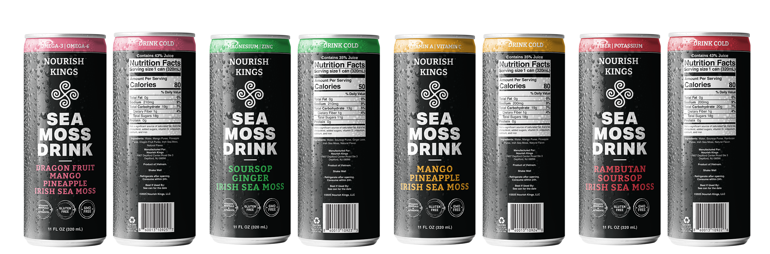 “Discover the Nourish Kings Superfood Variety Pack, featuring all four invigorating flavors of our beverages, each enhanced with nutrient-rich sea moss. These drinks are packed with a potent blend of superfoods, offering a refreshing boost to your well-being in every sip. Embrace the delicious taste and wholesome benefits of sea moss in every bottle!”