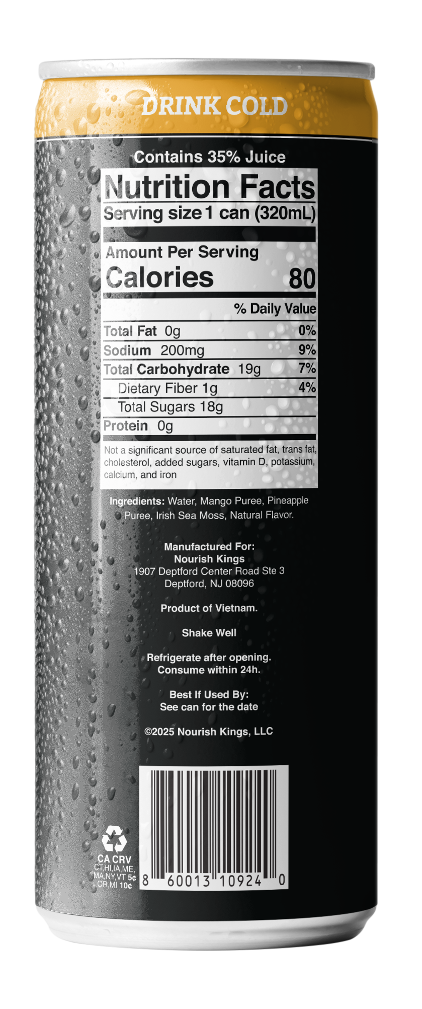 A refreshing blend of mango and pineapple with Irish Sea Moss. Best enjoyed cold. Shake well before drinking.